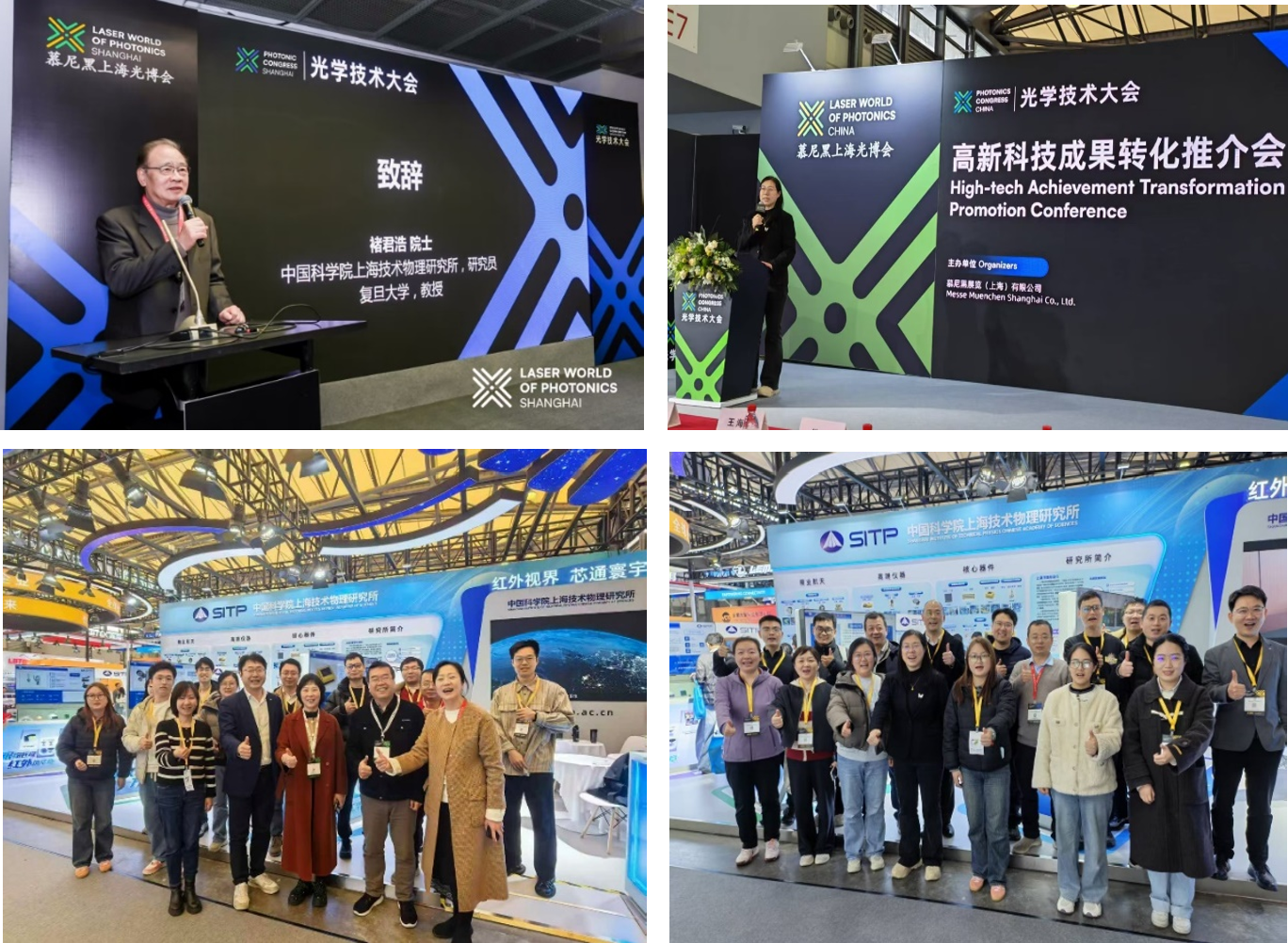 左上:褚君浩院士为红外探测技术前沿论坛致辞;右上:李雪出席高新科技成果转化推介会上海技物所专场