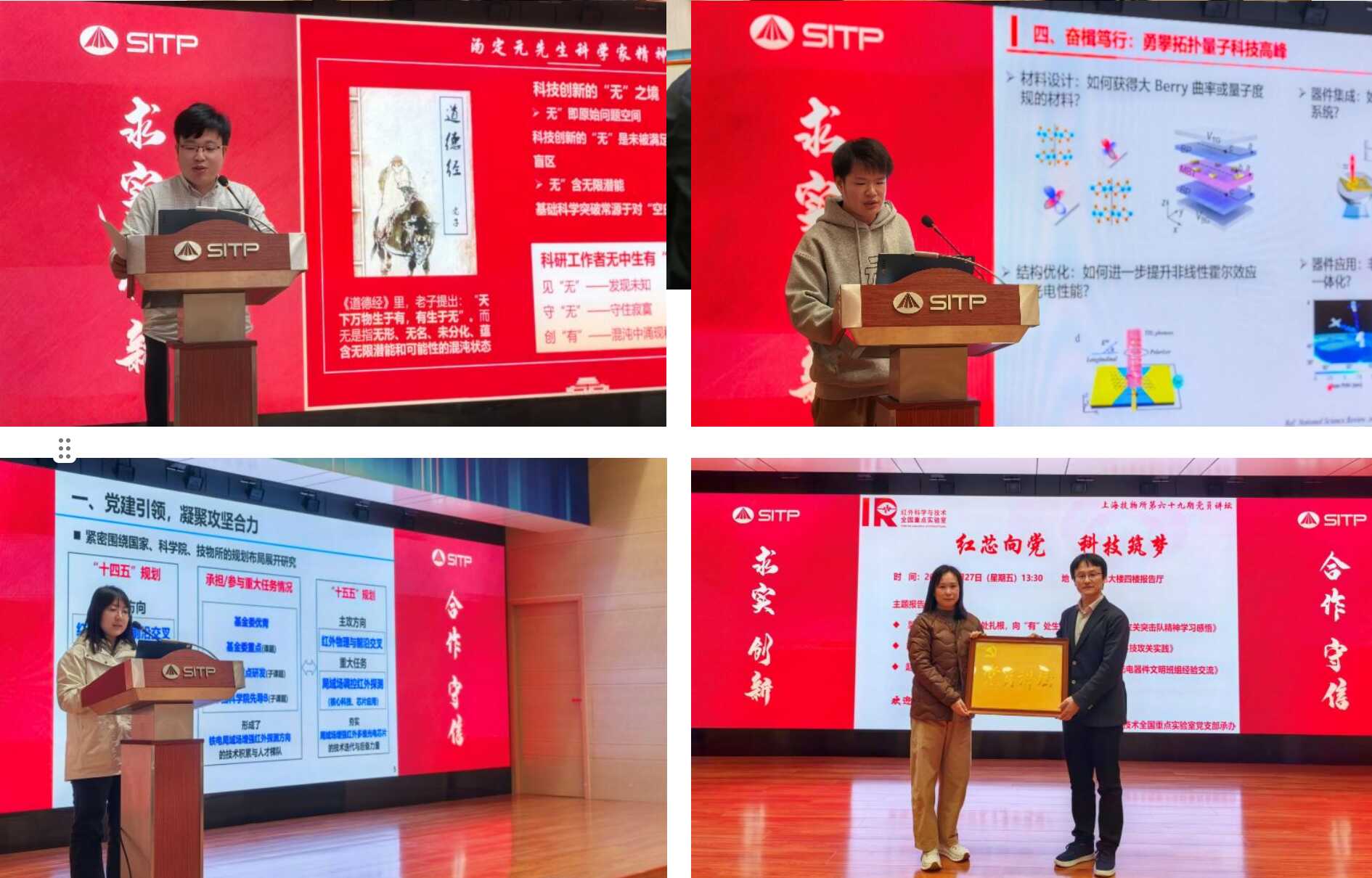 郭家祥(左上)、胡震(右上)、赵倩茹(左下)分别作主题分享报告;右下:胡伟达(右)与光电制造中心党支部书记陆瑾雯交接牌匾