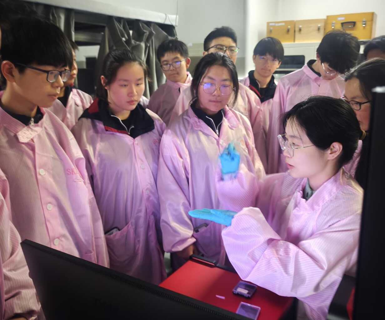 最令同学们兴奋的环节,是博士后余羿叶的现场讲解。她正在从事视觉假体方面的研究。余博士一边展示芯片样品,一边介绍相关科研成果与知识产权保护情况。同学们围在示波器和探针台前,仔细观察测试设备,认真了解技术研发与测试原理。一名男生忍不住感慨:“这比生物课上的模型酷多了!”